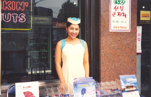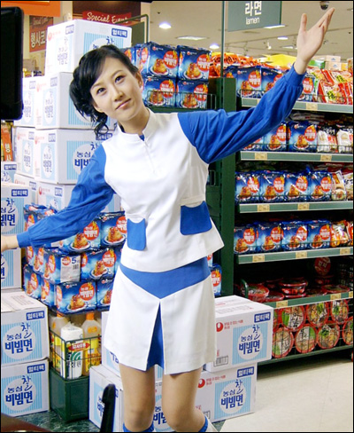 Hired through agencies by businesses promoting grand openings, special events or sales, these ladies can be found outside the entrances to night clubs, restaurants, stores, or even in supermarkets like Jang Yoon-jeong, the lovely lady pictured at right (and not to be confused with the singer of the same name). Their duties include such things as handing out flyers and promo freebies, delivering sales pitches, and dancing to pulsating techno music pumped out by large PA systems under archways of colorful balloons. In addition to their appearance, these girls are chosen through auditions for their speaking and dancing abilities, and have to be of a certain size, in order to fit into the outfits provided to them.