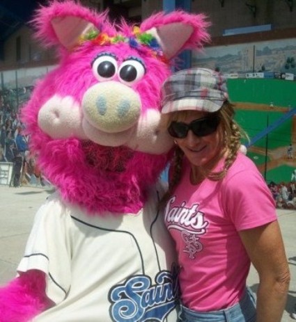 With the St. Paul Saints’ mascot, supporting her hometown baseball team