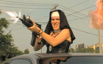 As Sister Kelly Wrath with her crucifix and AR-15 in Nun of That