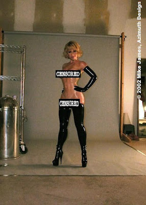 Mike has been known to start some of his shoots a little early by snapping a shot or two of his models checking their makeup and outfits before taking their mark. According to Mike, the sheer swimsuit Rachael’s checking out in mirror at right, didn’t have to get wet to become see-through.