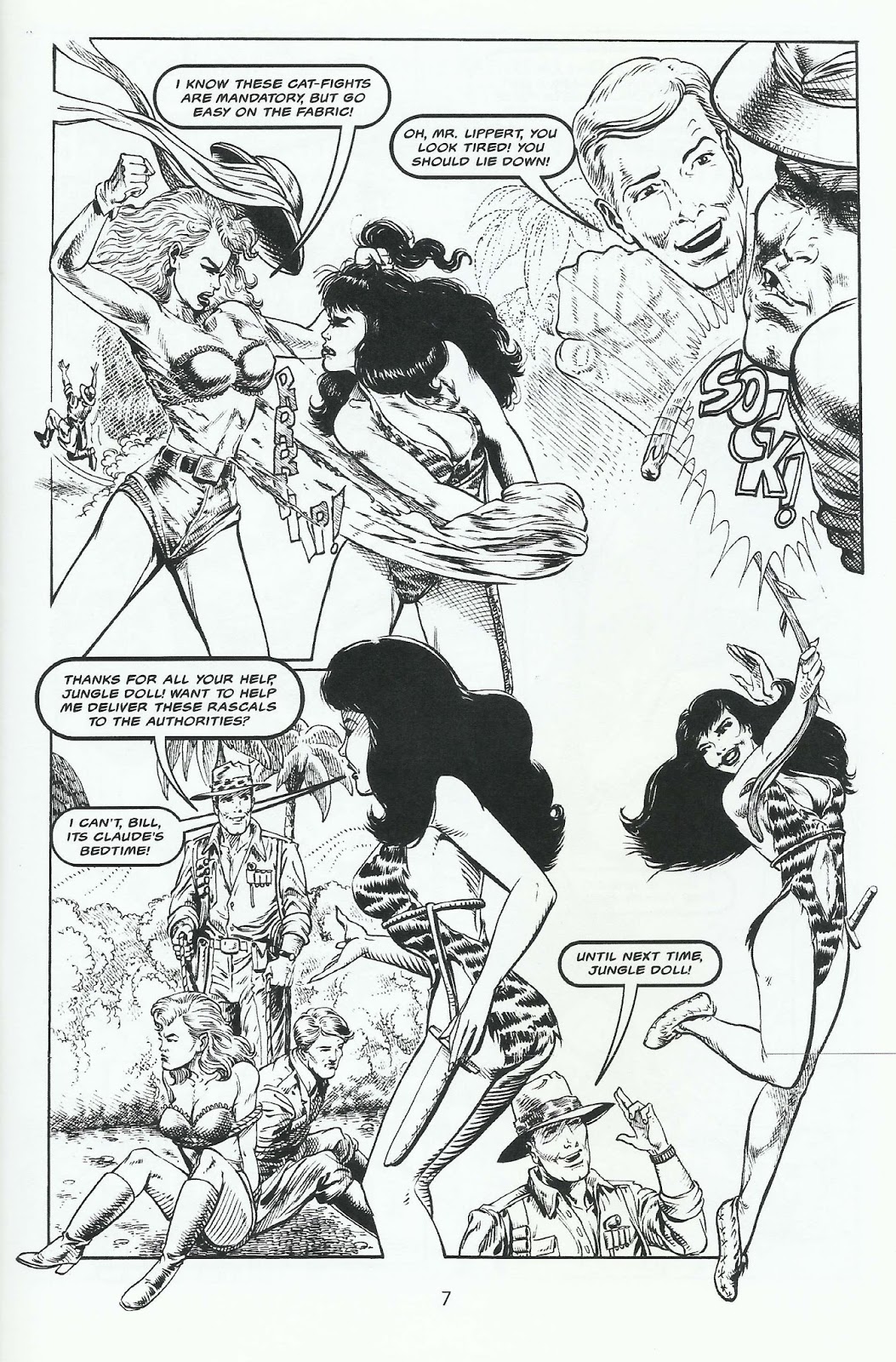 From back in 2011, Jungle Doll, which ran in Main Enterprises’ PRESENTS no. 5 (published by Jim Main and inked and lettered by the always-amazing Jeff Austin), was fairly early in my career as a professional cartoonist, so I hadn’t yet developed a very firm grasp on anatomy. Probably to make up for this, these Betsy episodes really went crazy in the gags department, and in doing so, I went wild, as you can see. (No pun intended.)